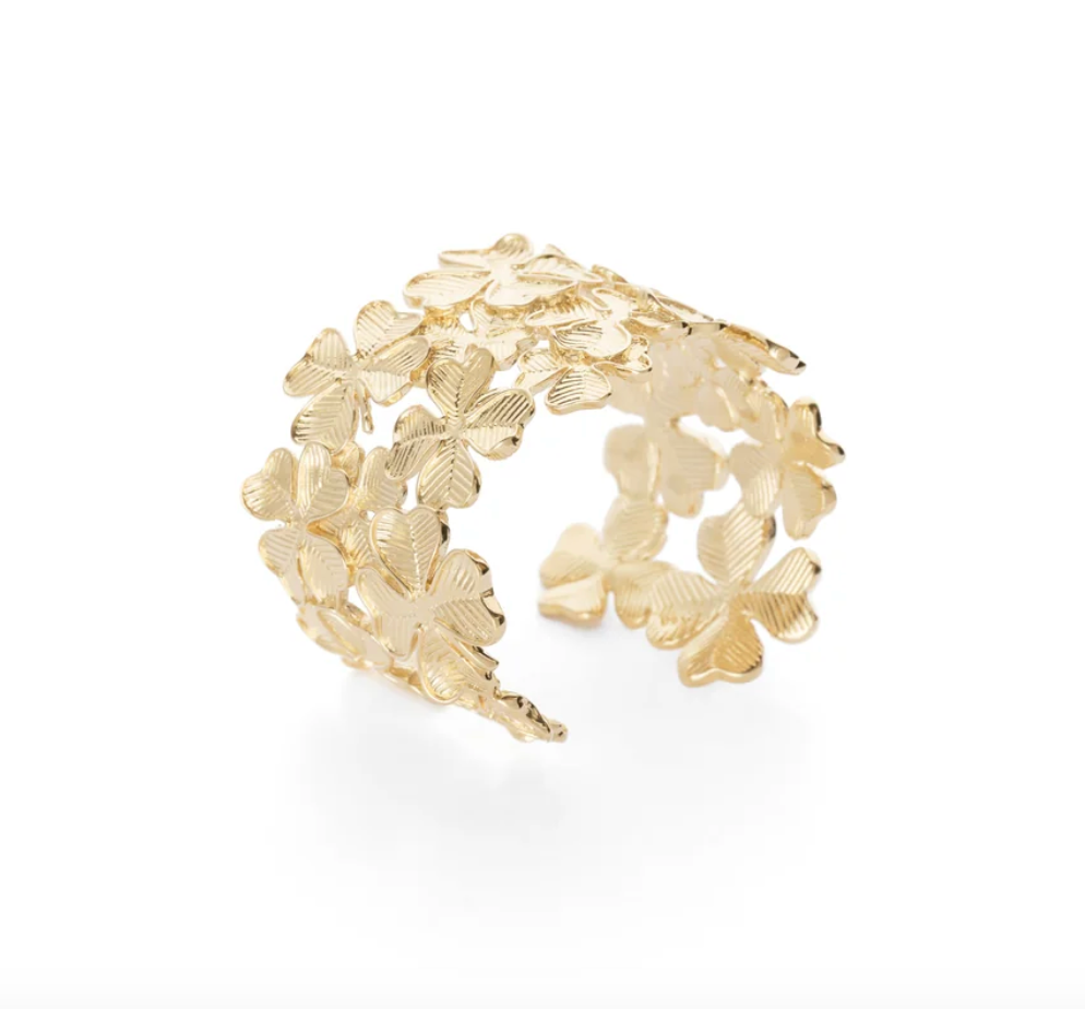 Manchette Shamrock, ajustable et confortable au poignet. Le trèfle à quatre feuilles incarne la beauté rare de la nature, associée à la chance et au bonheur. Cette exception naturelle et ses origines mythiques en font un objet de fascination intemporelle, apportant une touche de mystère et d'optimisme à ceux qui croisent son chemin.