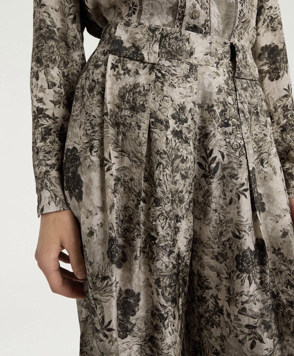 Pantalon imprimé placé en tissu jacquard viscose fluide de haute qualité. Poches insérées sur le côté. Coupe ajustée, jambe palace, longueur maxi.
