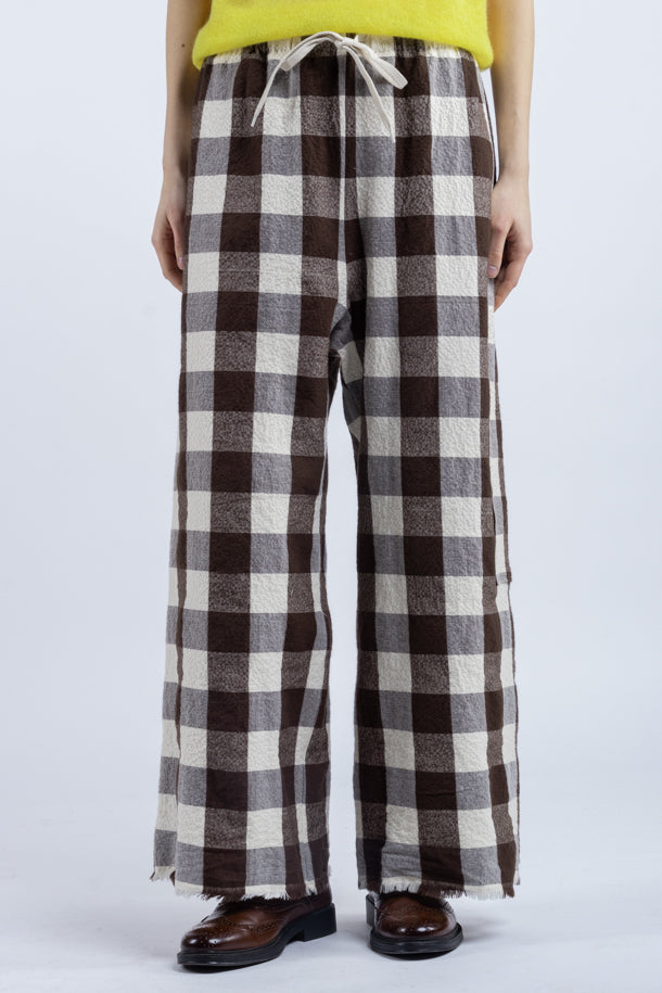 Pantalon coupe large droite écru à carreaux marrons. Asymétrie des poches, une sur le côté à gauche et une à l'arrière à droite. S'ajuste par un lien devant.