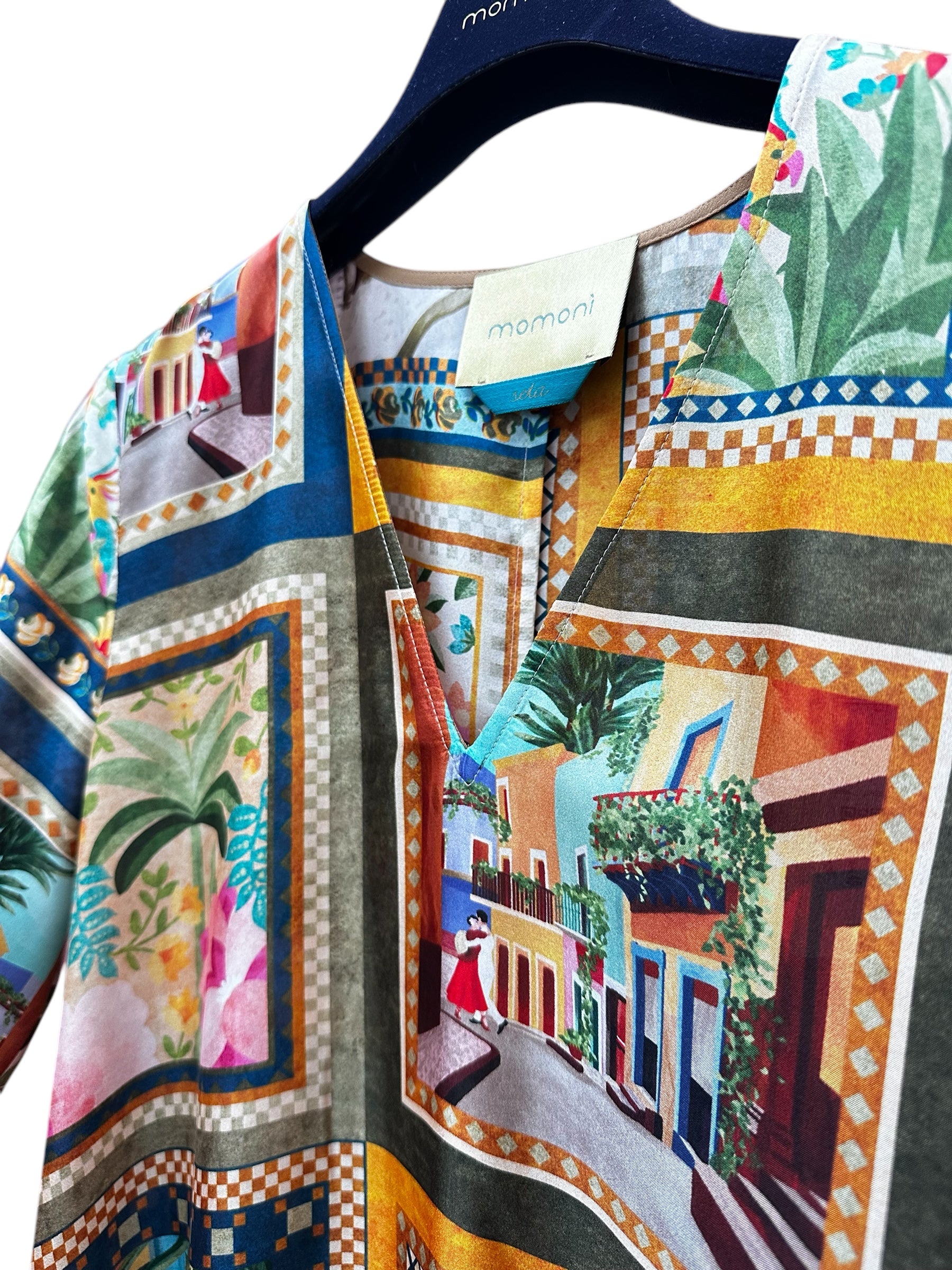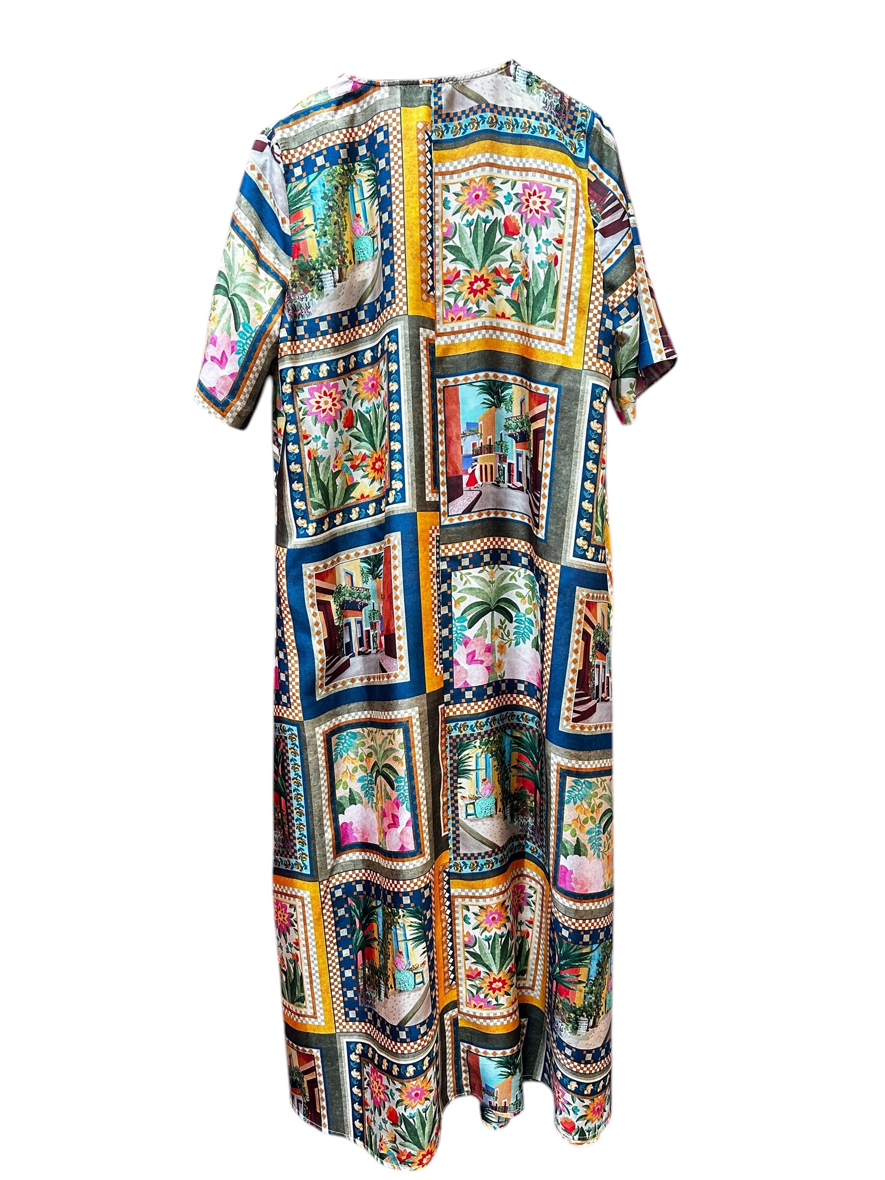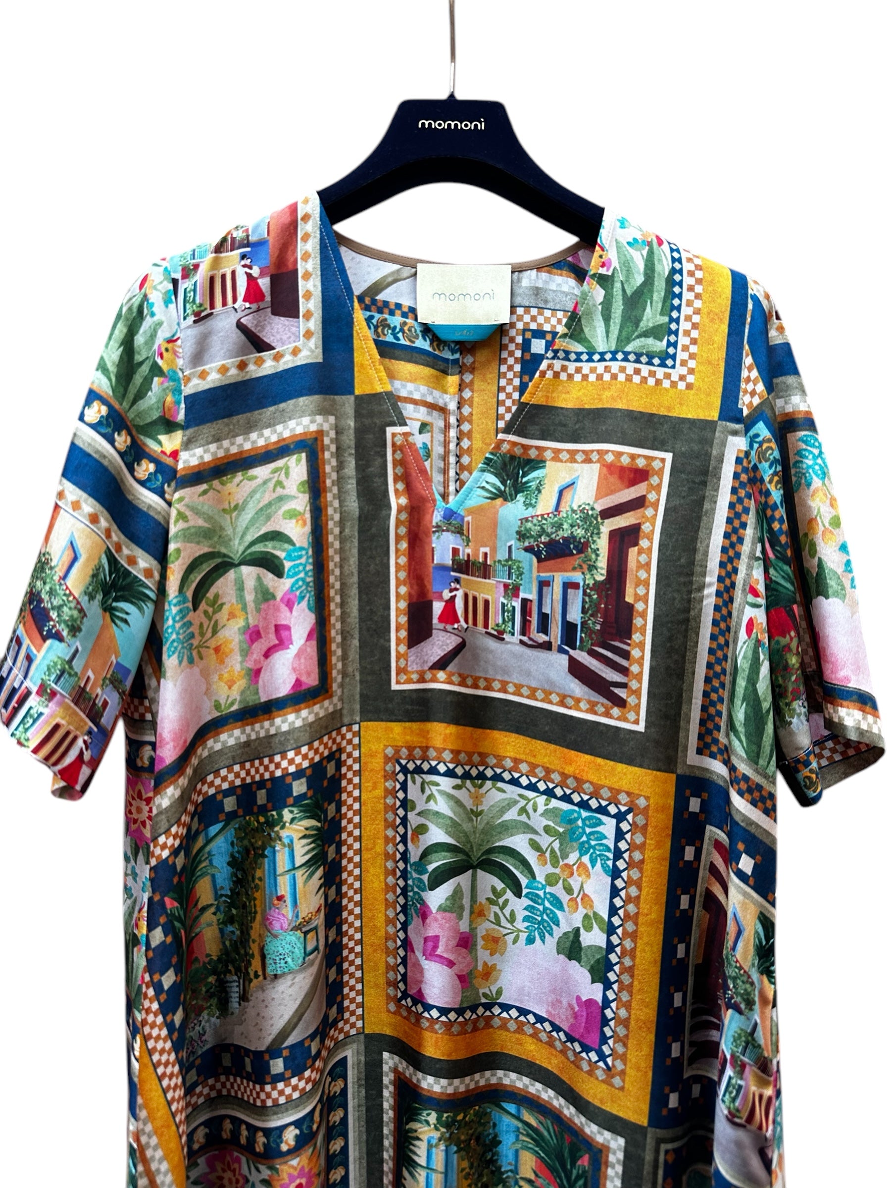 Robe tunique longue, simple et raffinée, en habotai de soie imprimée. Manches courtes et col V.