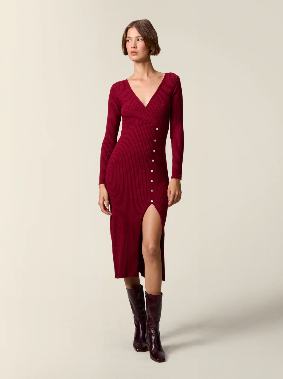 Robe pull mi-long boutonnée, manches longues, col v, fente sur le côté gauche, coupe près du corps.