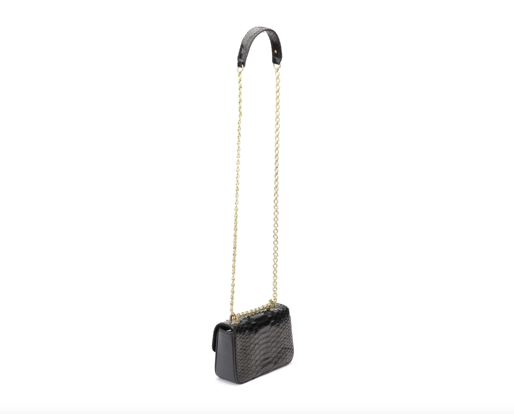 Sac bandoulière pour femme en cuir de python noir orné d'un scarabée en laiton. Côtés en cuir lisse. Bandoulière chaîne à porter en simple ou en double. Fermoir par rabat aimanté. Intérieur doublé en coton avec une poche zippée.