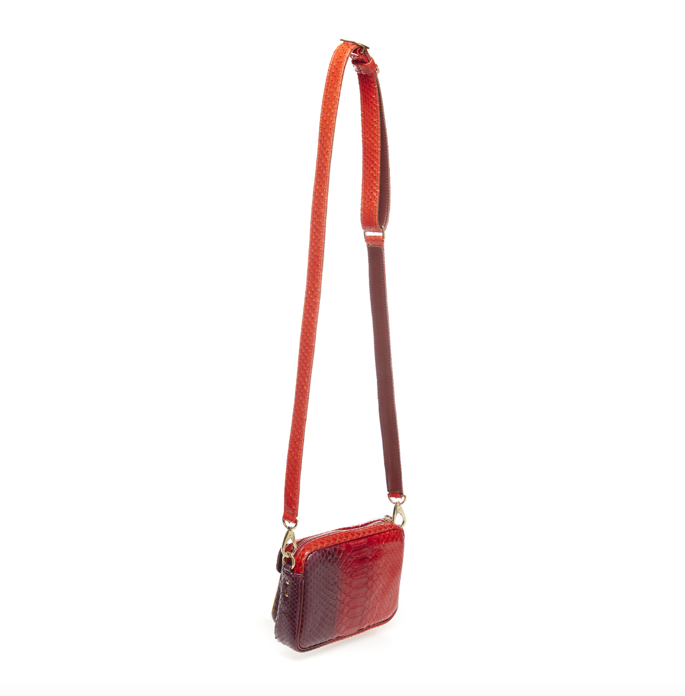 Sac en python dégradé rouge orangé. Compartiment avec une poche à l’avant. Poche interne. Bandoulière amovible avec crochets et réglable doublée en cuir. Fabriqué artisanalement à la main.