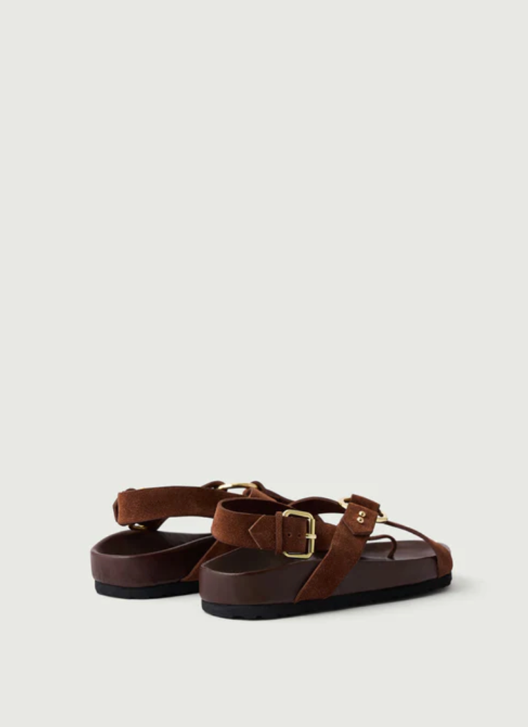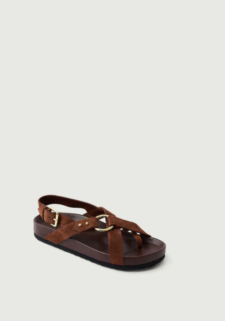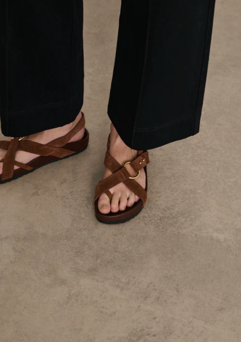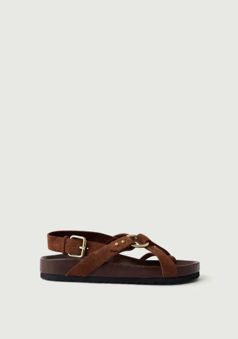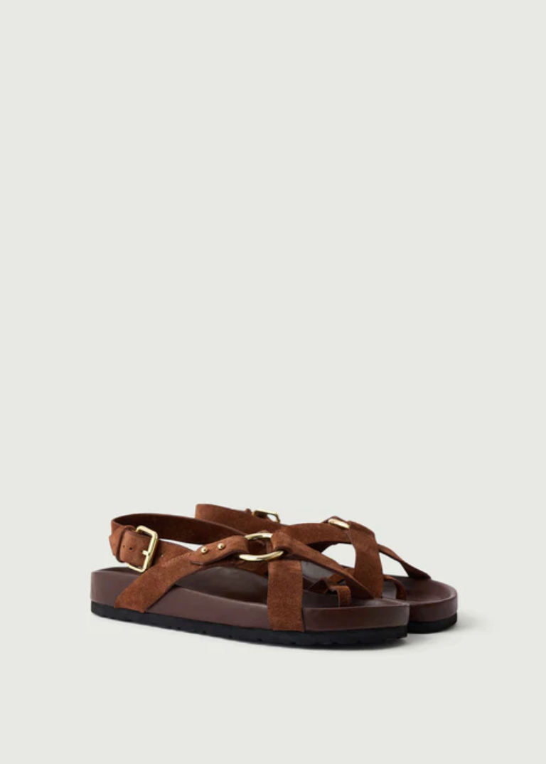 Sandale avec brides croisées pour Femme. Casual et moderne, à porter tous les jours avec des shorts ou pantalons à hauts revers par exemple. Se referme grâce à une bride à l’arrière et prend le pouce à l’avant pour un bon maintien. Métallerie dorée, modèle confortable grâce à sa semelle en liège recouverte de cuir qui épouse le pied. Fabriquée en Inde.