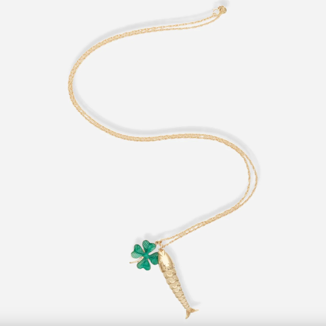 Sautoir Nemo, composé d'un trèfle émaillé de couleur vert et d'un poisson articulé en laiton doré. Le trèfle à quatre feuilles incarne la beauté rare de la nature, associée à la chance et au bonheur. Cette exception naturelle et ses origines mythiques en font un objet de fascination intemporelle, apportant une touche de mystère et d'optimisme à ceux qui croisent son chemin. Le poisson est un symbole fort de bonheur associé à l'amour, aux relations et à la famille.