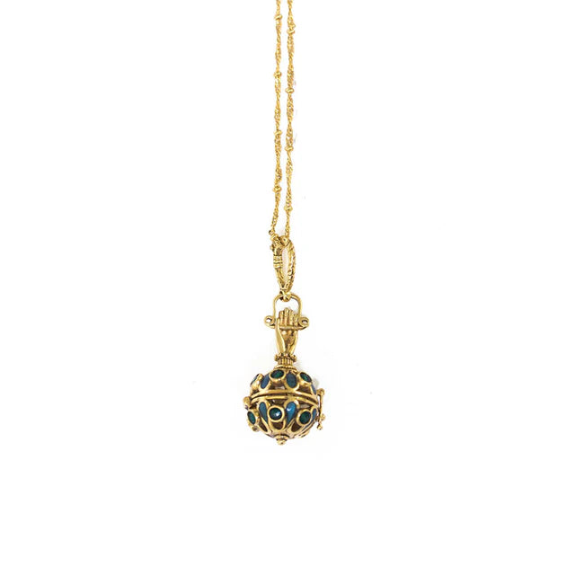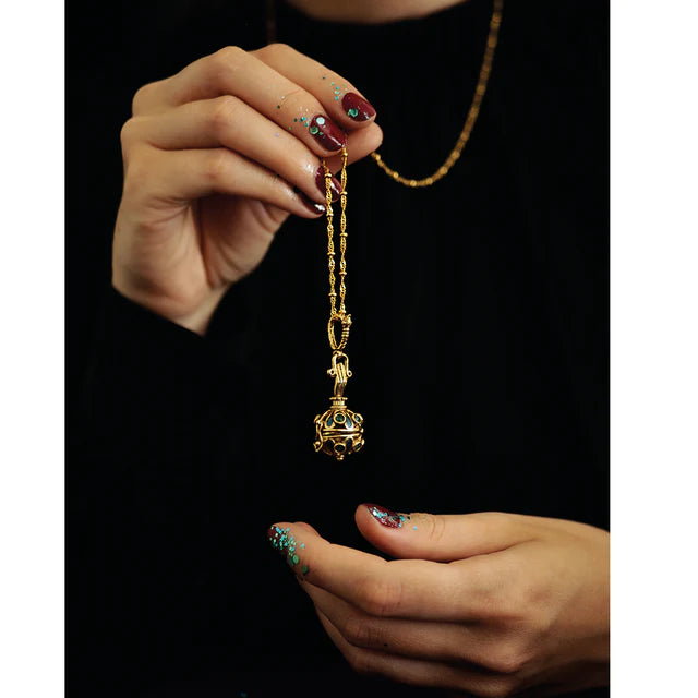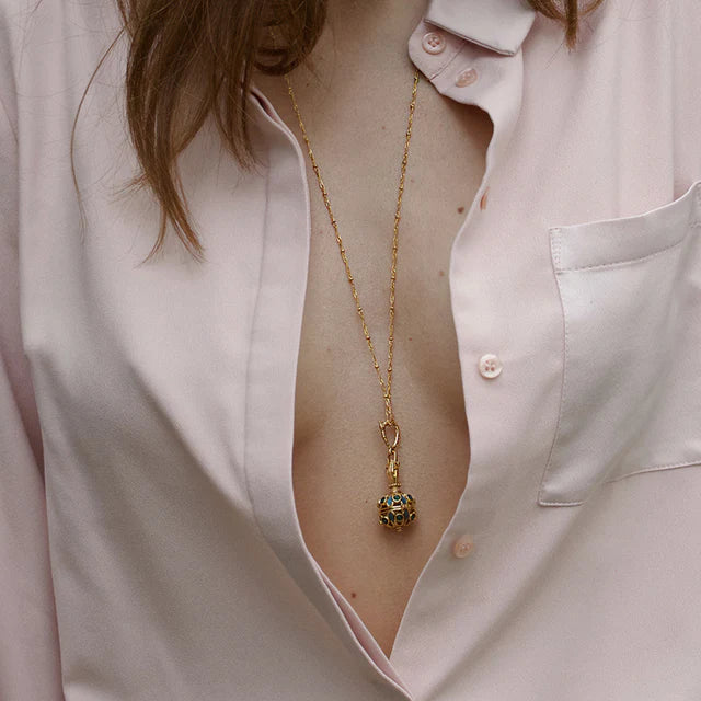 Sublimez votre tenue avec ce sautoir en laiton bain d'or, émail et pierres semi-précieuses Agate verte, un bijou raffiné et élégant pour rehausser votre style. Ce collier d'une longueur de chaîne de 72 cm est agrémenté d'un pendentif cage de 4,5 cm qui s'ouvre, offrant une touche originale et mystérieuse à votre look.