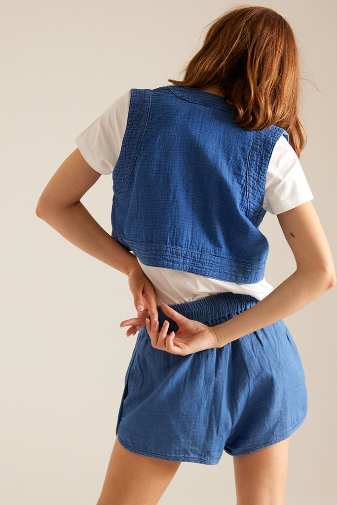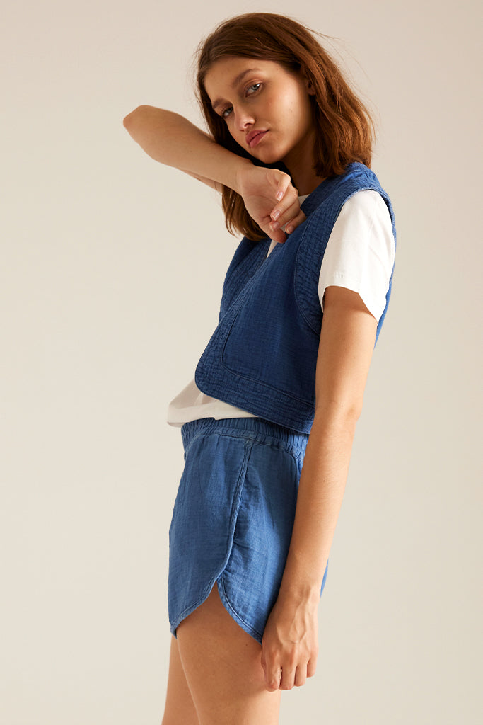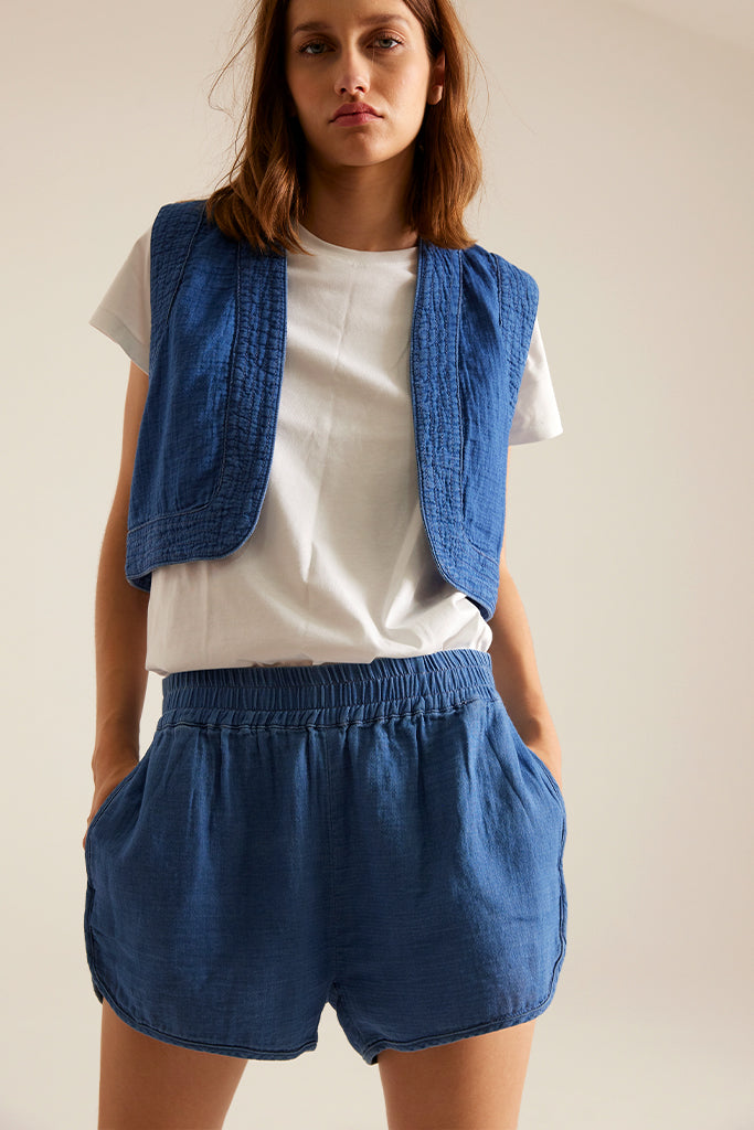 Short casual pour Femme, esprit sportwear. En gaze double étoffe indigo lavée. Tissée en Italie. Taille élastiquée. Biais dans la matière. Poches dans la couture. Coupe courte.