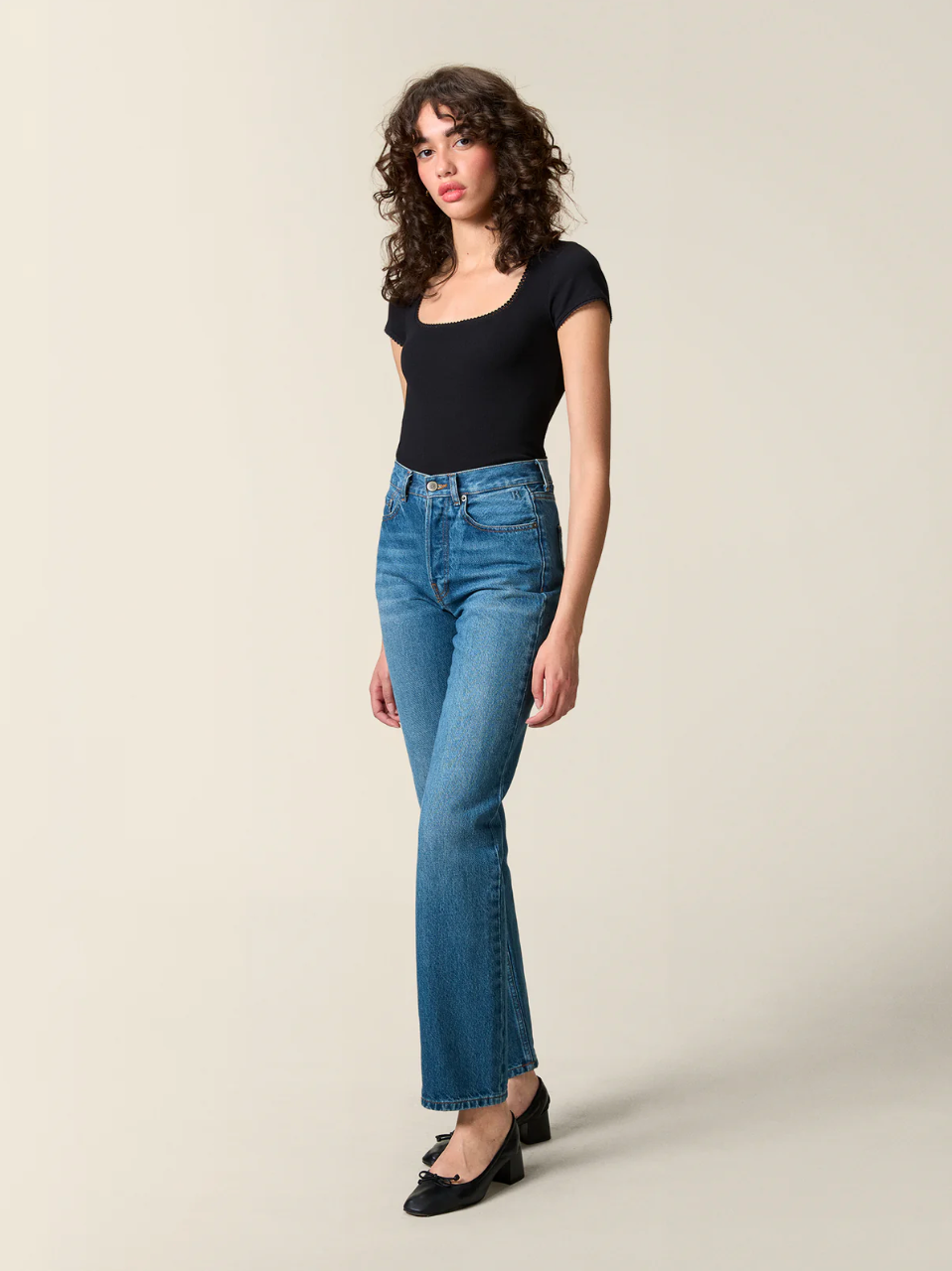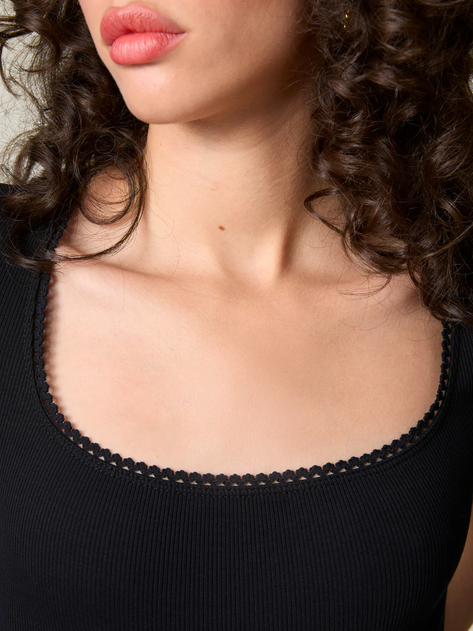 T-shirt en jersey de coton uni col carré. Bordure croquet au niveau du col et des manches. Taille normalement. Fabriqué en France.