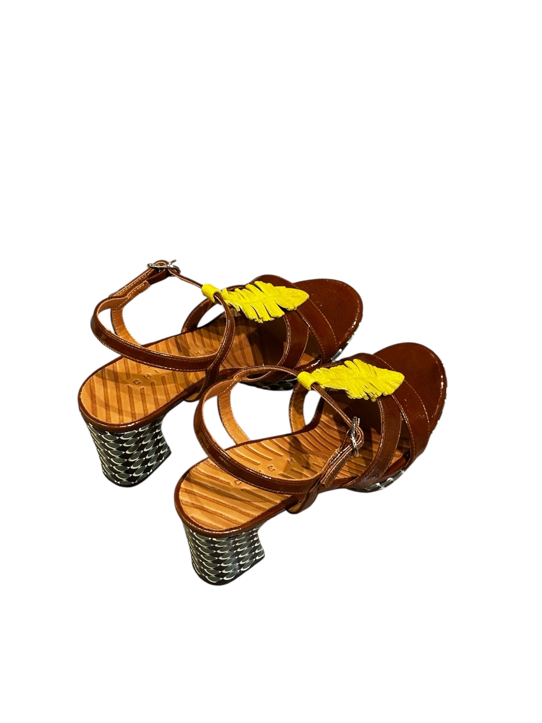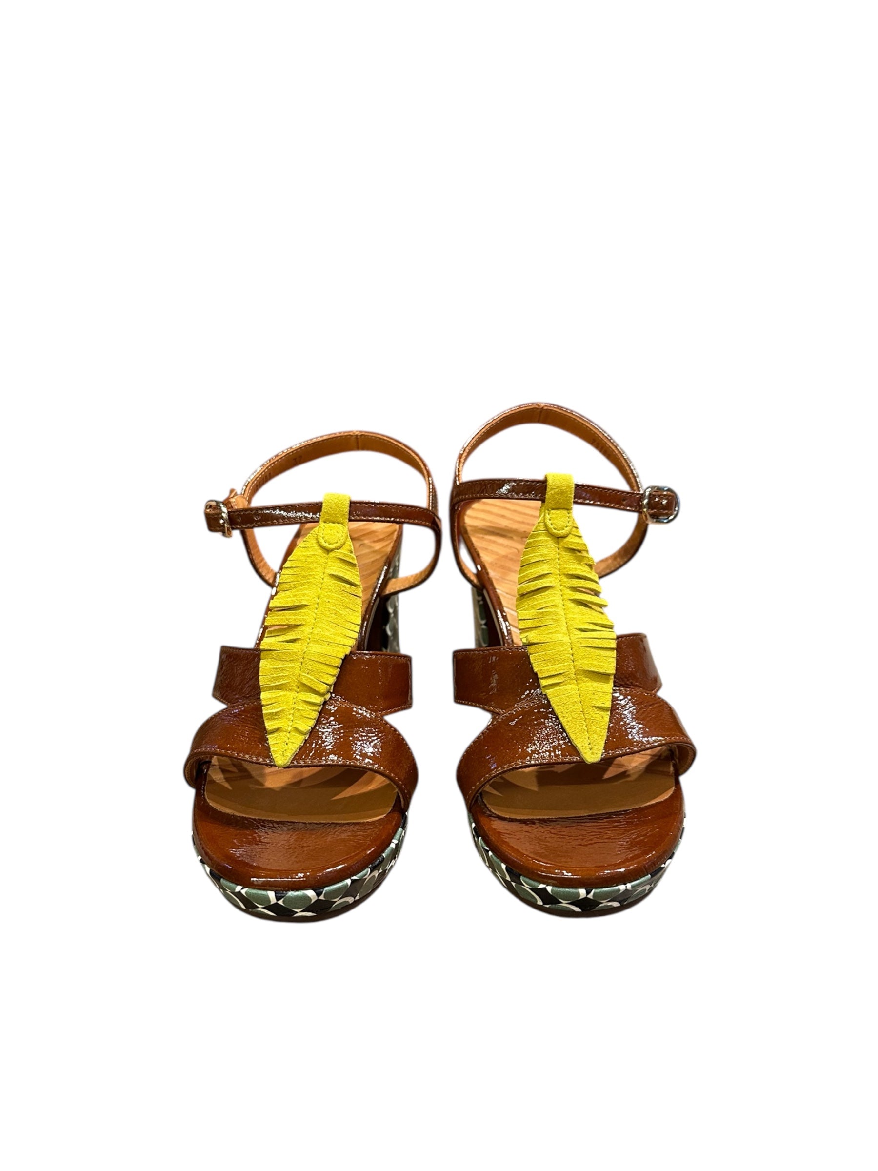 Chaussures à talons Chie Mihara, détail feuille jaune sur l'avant du pied et cuir marron, talon et patin imprimé crème, noir et vert. Lanière réglable à la cheville. Ce modèle est une exclusivité Nous les Libellules, nous avons composé le mix couleurs/matières.