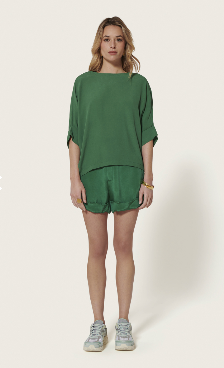 Top Buckley au dos nu arrondi et manches courtes aux larges revers. Coupe ample et fluide, encolure arrondie proche du cou, épaules tombantes, et dos nu en U maintenu par un lien en cuir amovible.