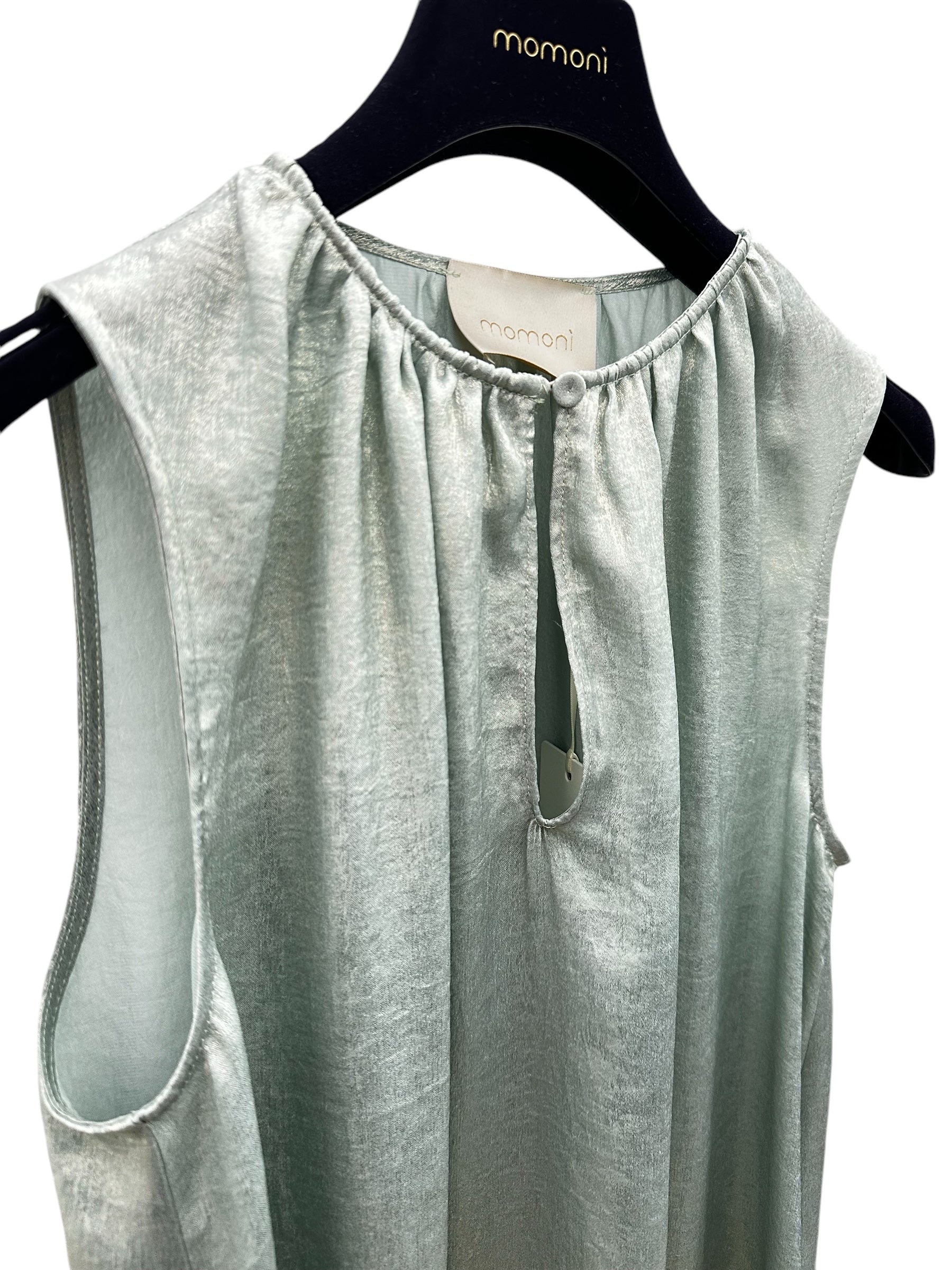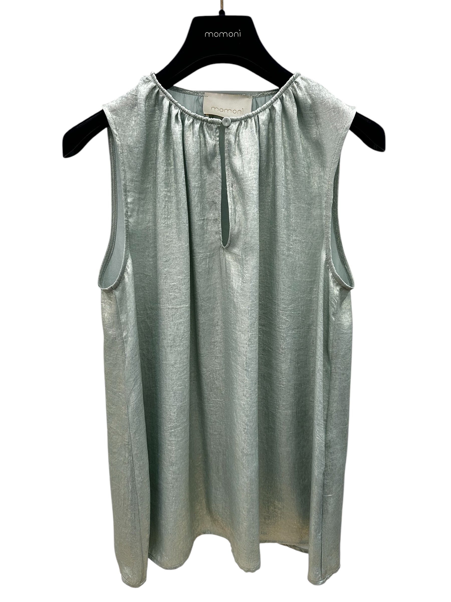 Top Cris laminé fluide, encolure ronde, fronces sur le devant et dans le dos sur l'extérieur du col. Ouverture en forme de goutte, fermée par un bouton. Idéal comme top d'été ou comme sous-veste.