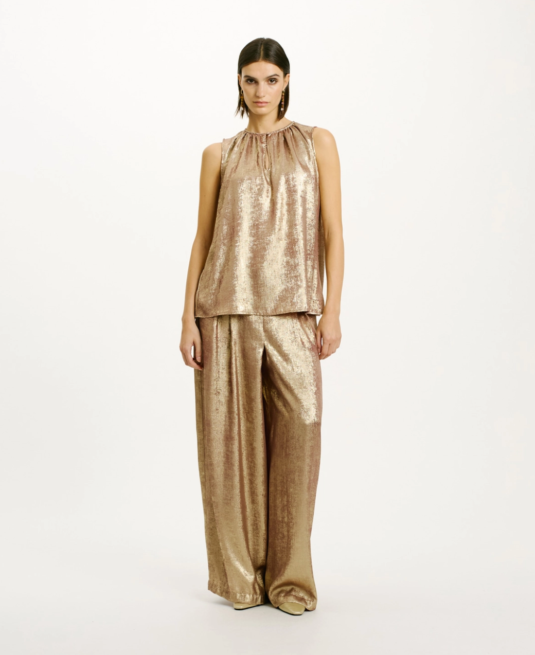 Top Cris laminé fluide, encolure ronde, fronces sur le devant et dans le dos sur l'extérieur du col. Ouverture en forme de goutte, fermée par un bouton. Idéal comme top d'été ou comme sous-veste.