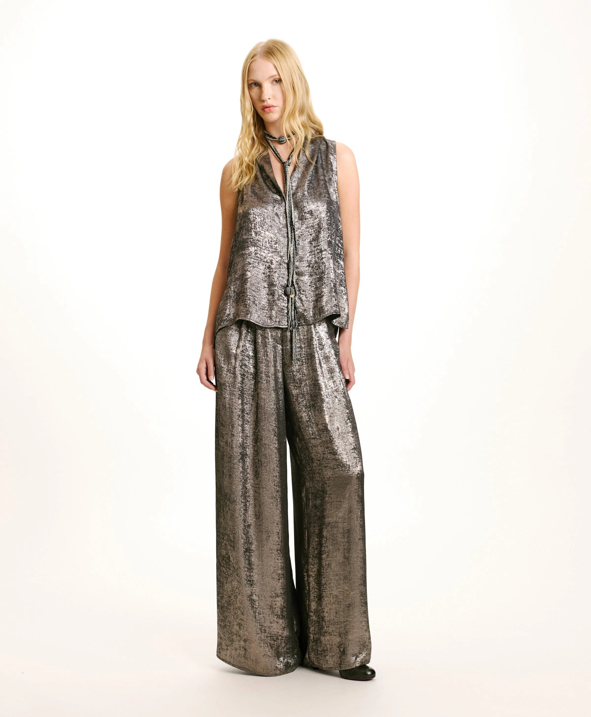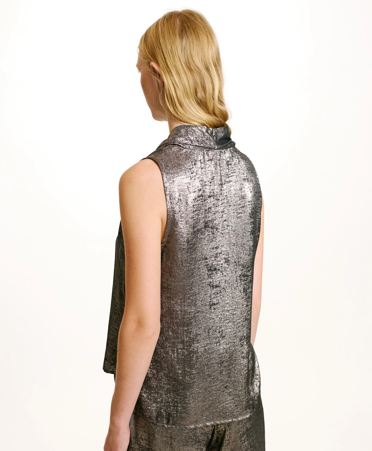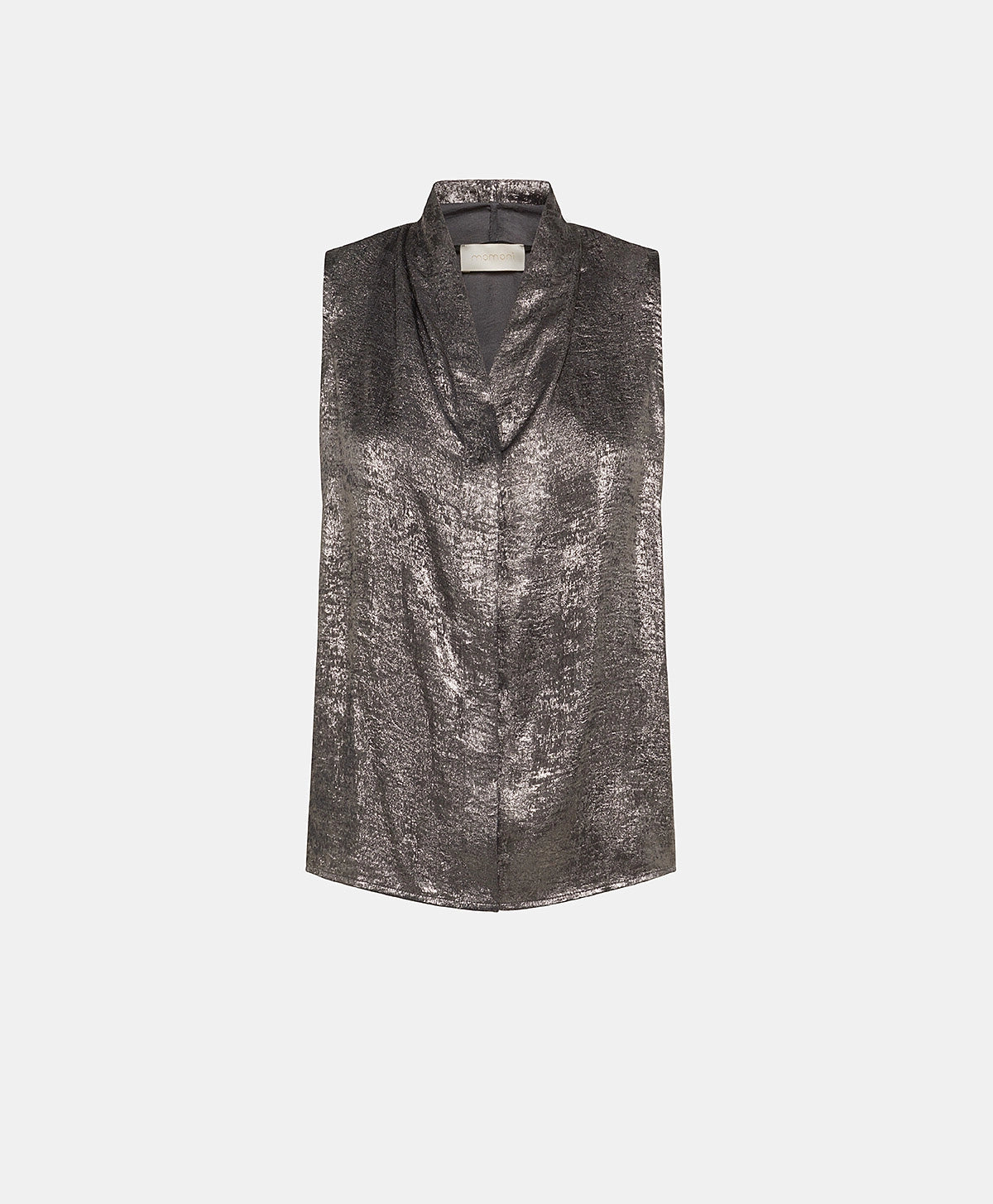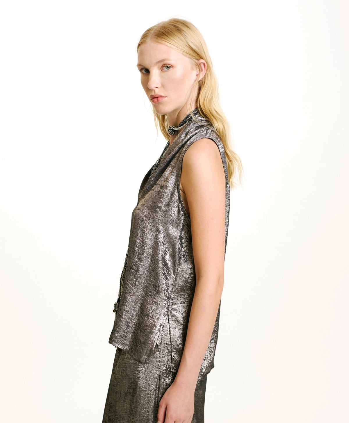 Le top Kiri sans manches en laminé fluide et argenté de la marque italienne Momoni.
