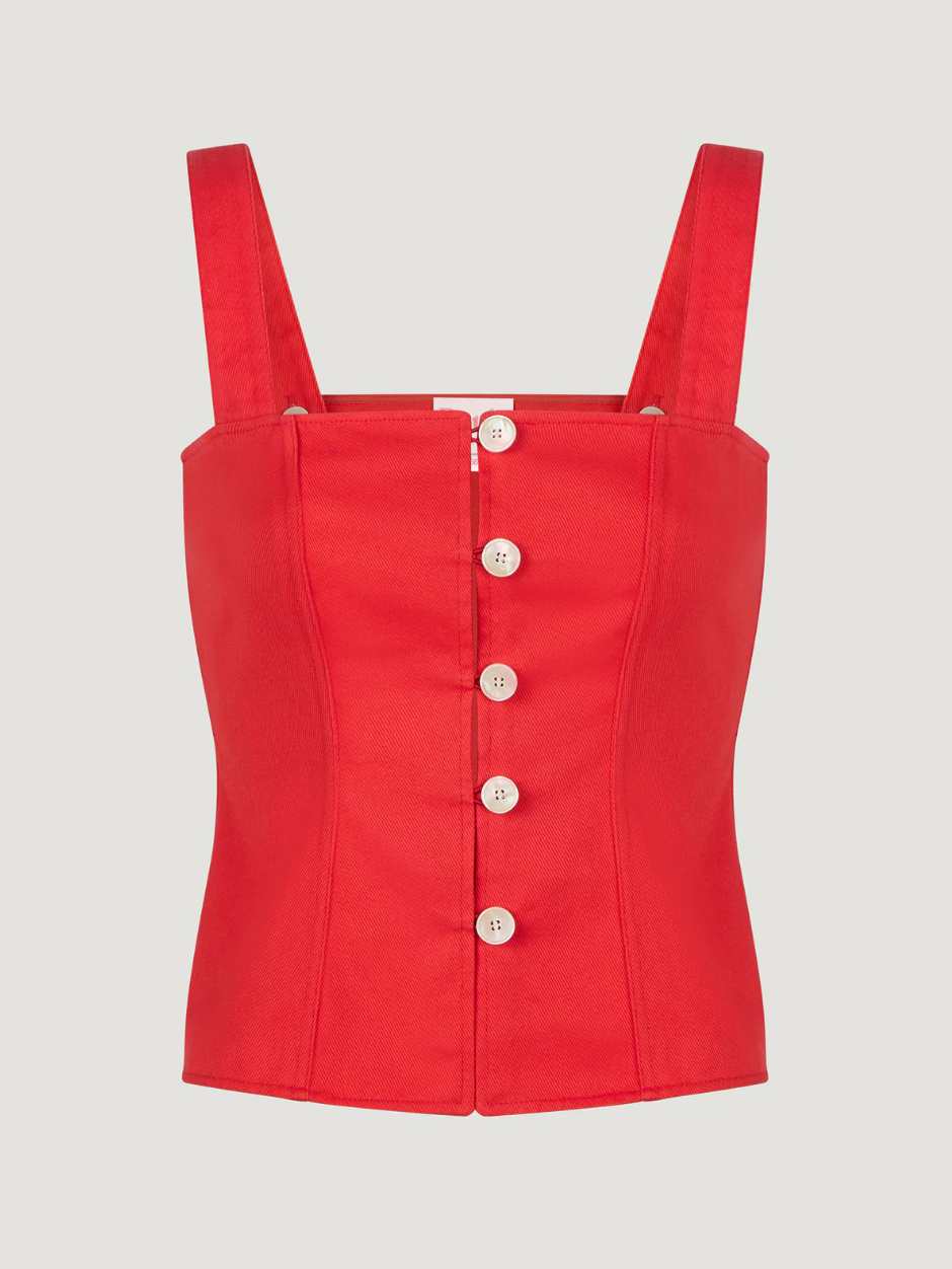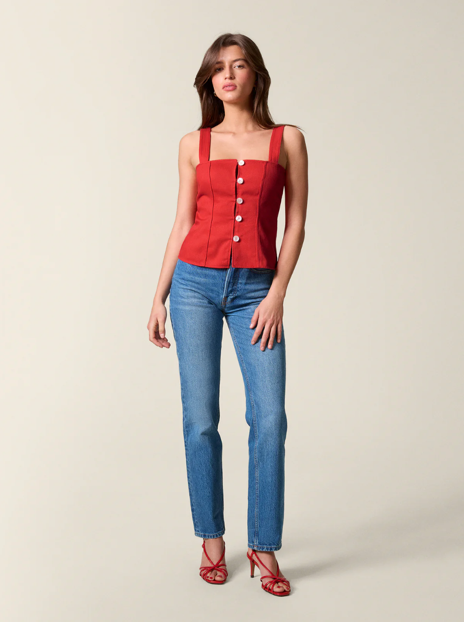 Top Maro à larges bretelles, type bustier uni. Bretelles ajustables par deux boutons invisibles dans le dos. Boutons nacrés, pinces avant et dos. Fabriqué Au Portugal.