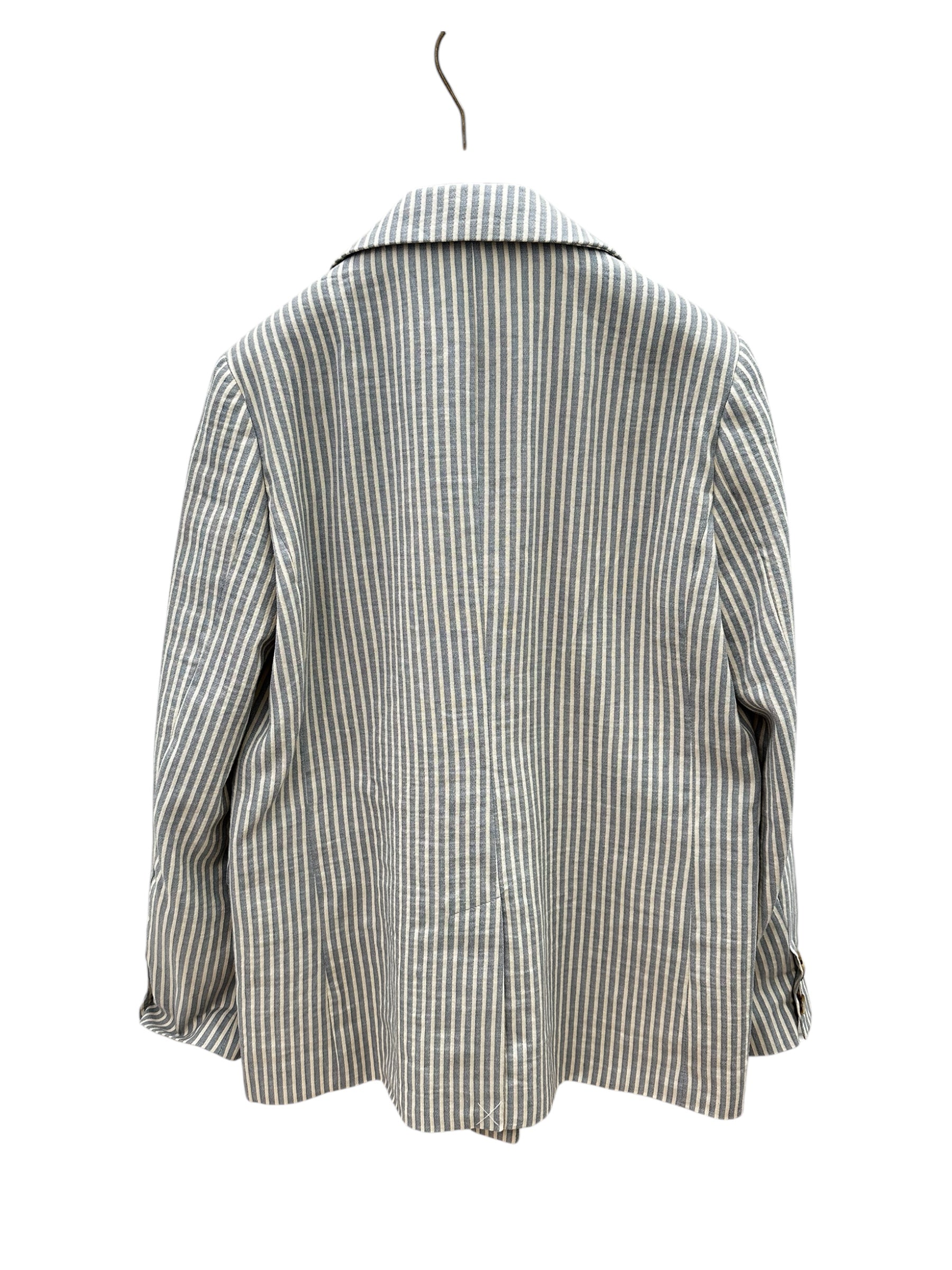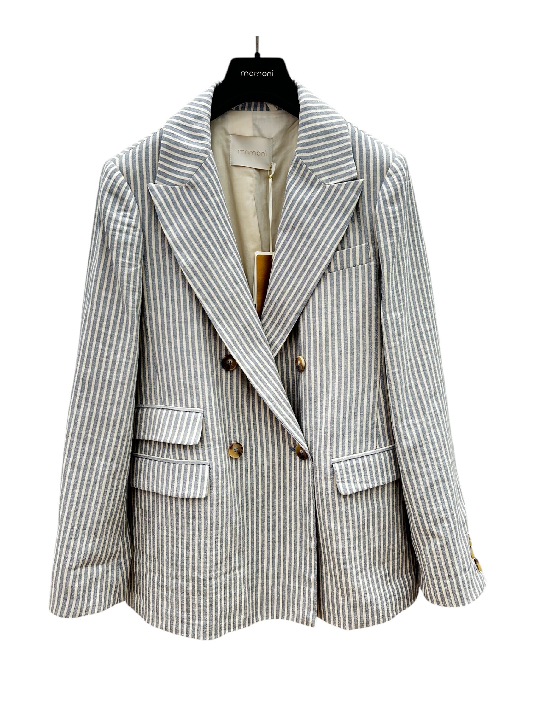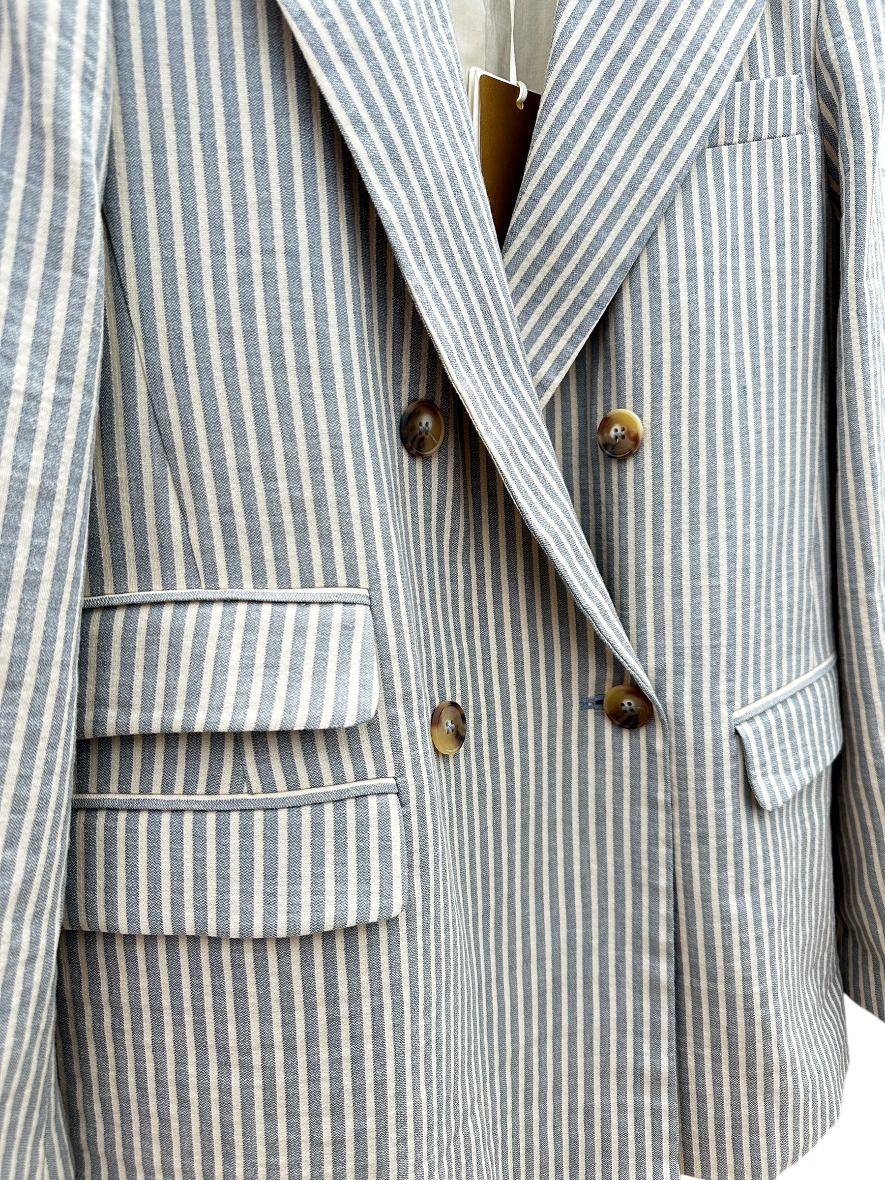 Veste Odo à rayures bicolores, coupe régulière, double boutonnage et col en pointe. Possède des pinces sur le devant et une double poche à rabat sur le côté droit. Détail de fente dans le dos. Entièrement doublée. Peut former un ensemble parfait avec le pantalon Janeiro ciel/crème de la même collection.
