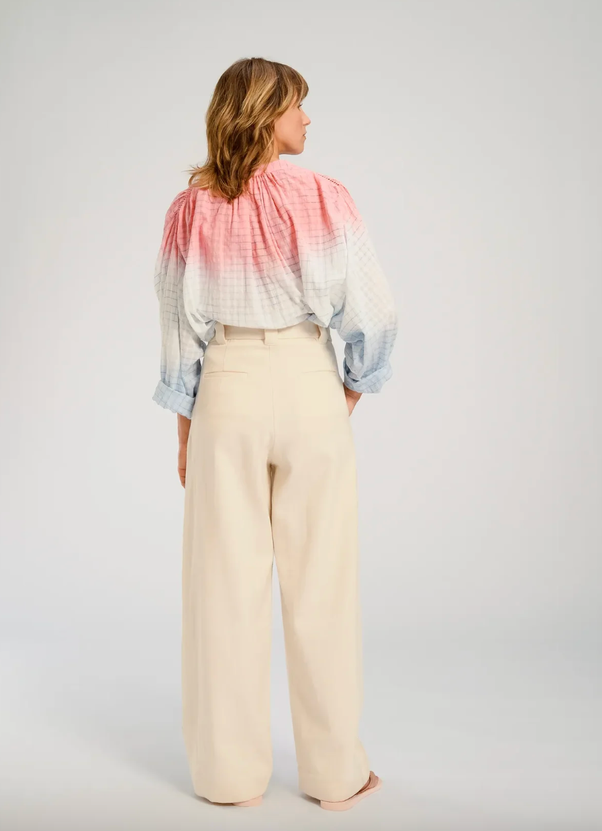 La blouse bleu ciel Himi en khadi coton, est tissée à la main dans la région du Bengale et ensuite, est teinte en plusieurs temps selon la technique du tie & dye. Craquer sur cette blouse, c'est célébrer la valeur artisanale, l'authenticité du geste et la poésie de la manière naturelle.