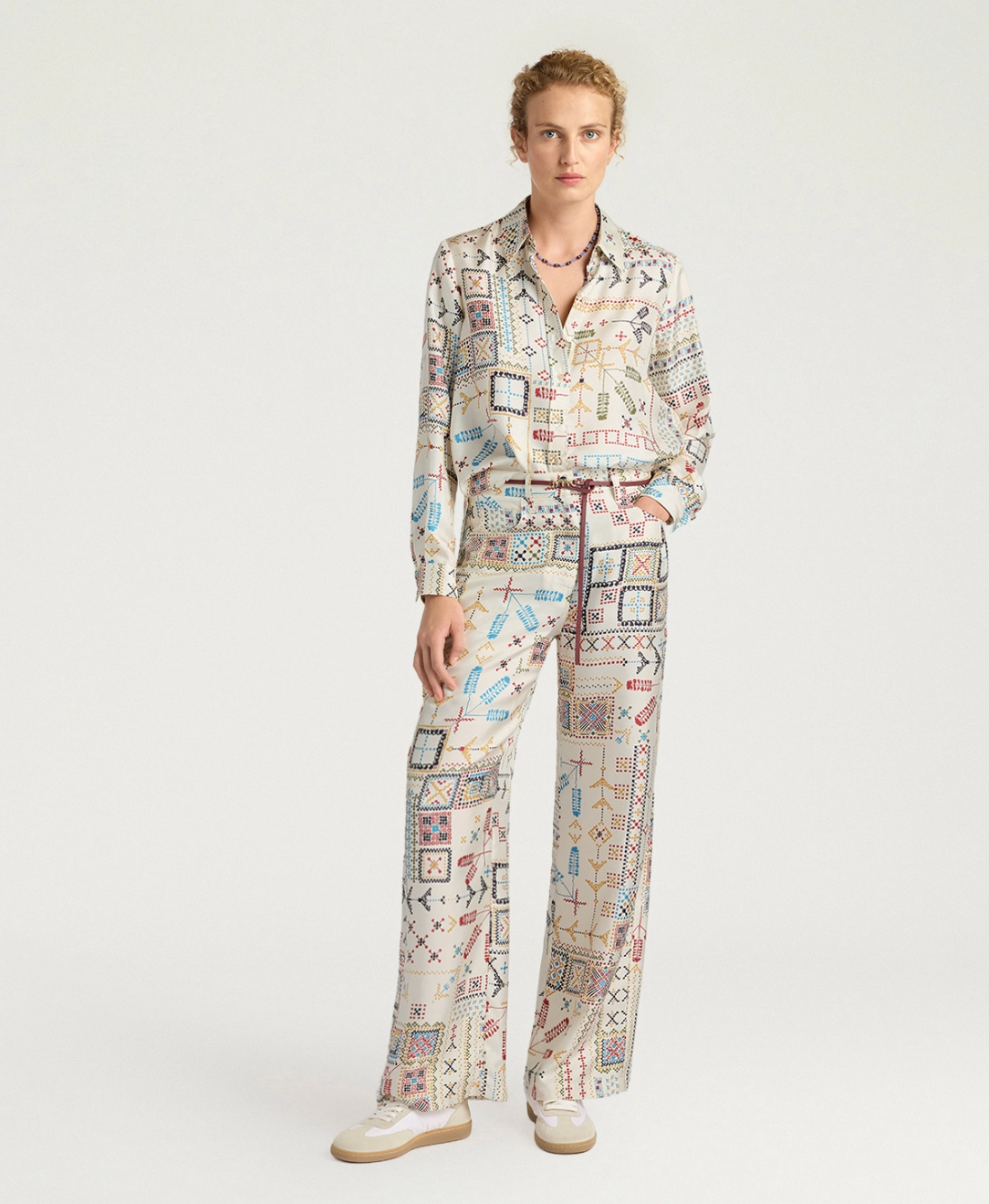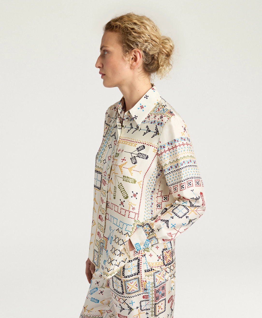 Chemisier soie col italien, bas arrondi, boutonnage apparent et poignets avec fentes et boutons pour ce classique de la chemise dans les imprimés iconiques Momonì sur du sergé de pure soie imprimé en Italie.