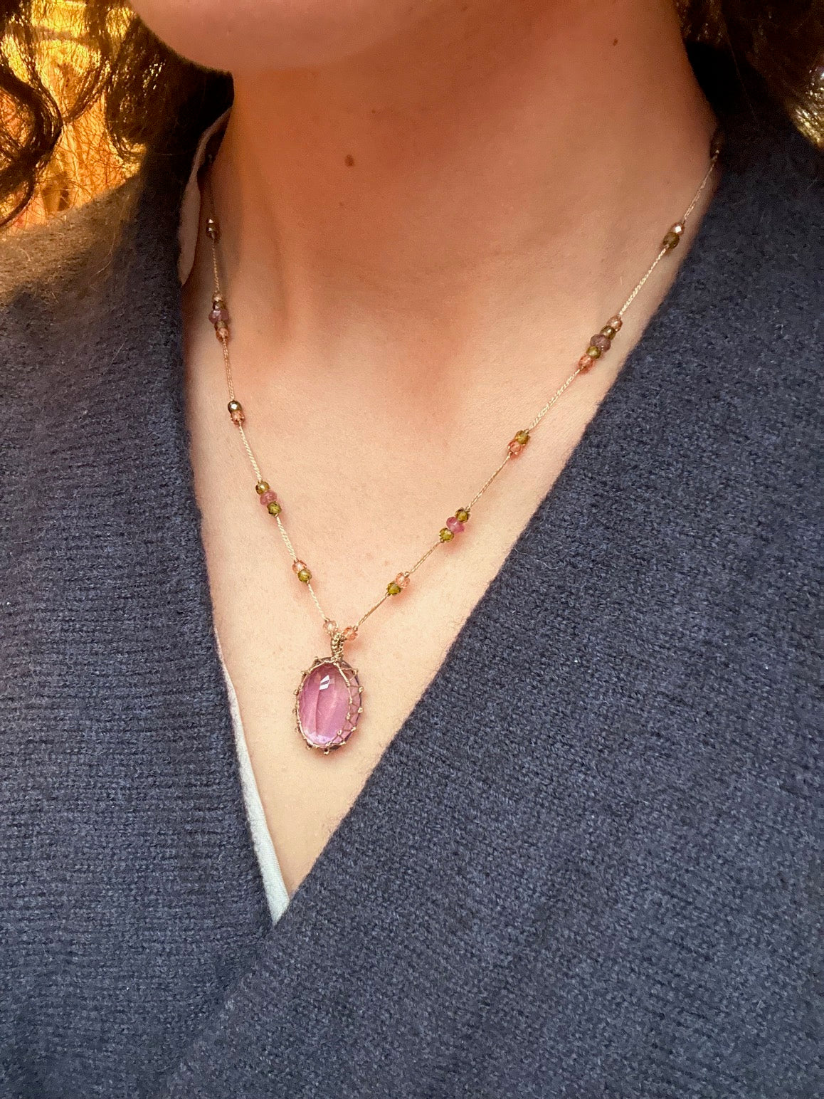 Pierre pendentif montée sur un fil de soie résistant, associé à de petites pierres semi-précieuses le long du collier.