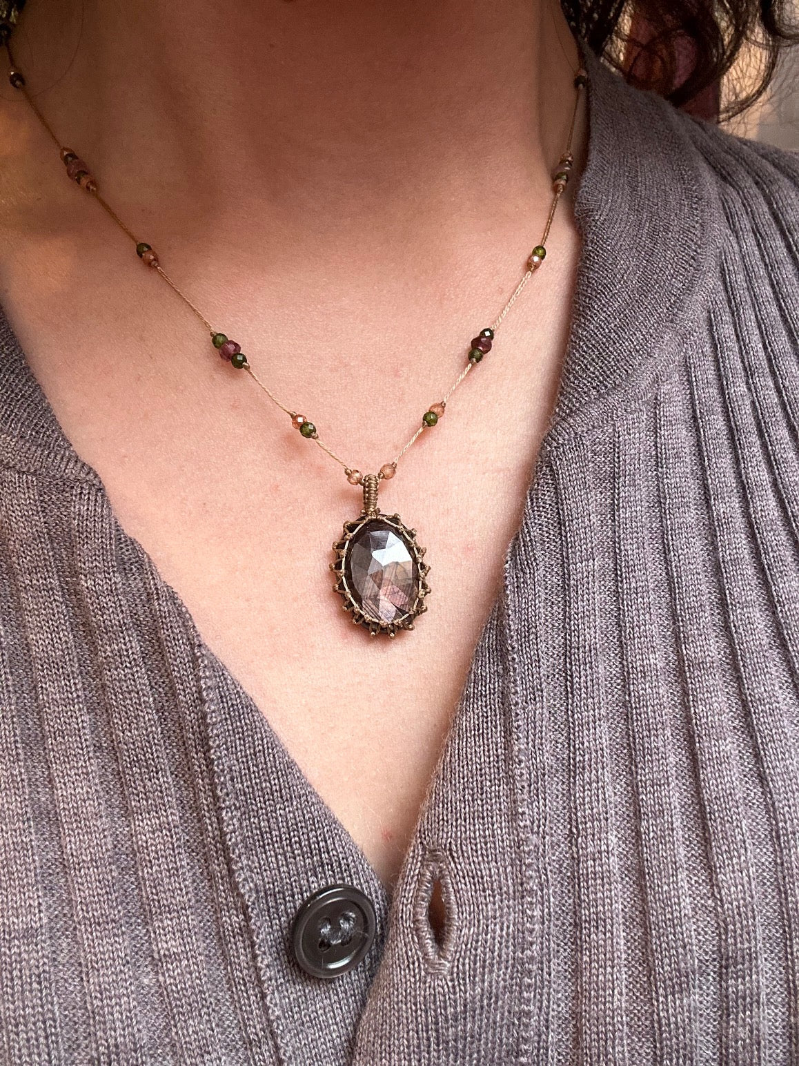 Pierre pendentif montée sur un fil de soie résistant, associé à de petites pierres semi-précieuses le long du collier.