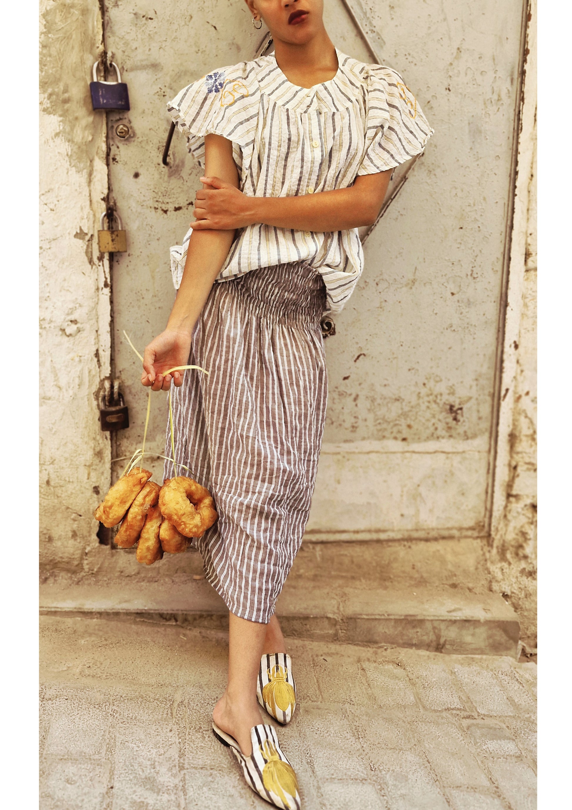 Jupe en tissu rayé gris et blanc. Peut se porter en jupe ou en robe bustier. Taille unique.