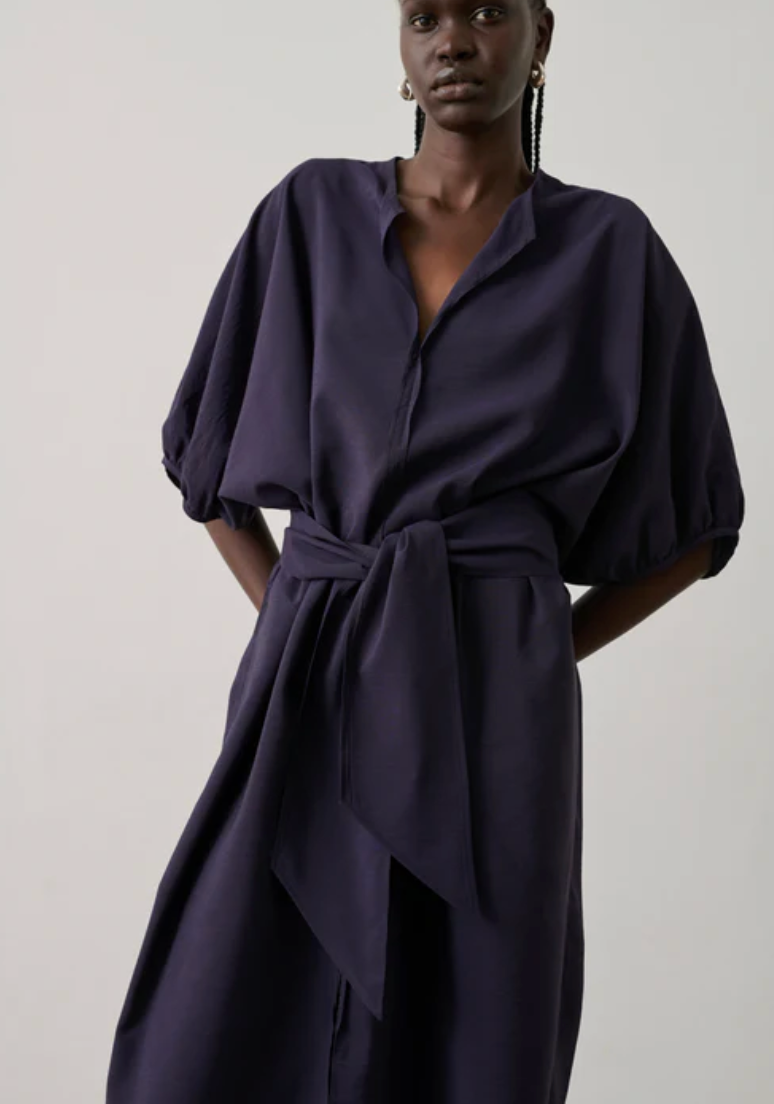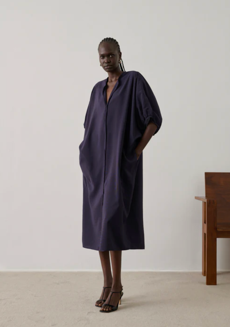Robe coupe ample et généreuse, pouvant se porter ceintrée ou non. Manches courtes froncées, encolure plongeante en V, détails de fronces au dos. Poches insérées dans les coutures latérales.