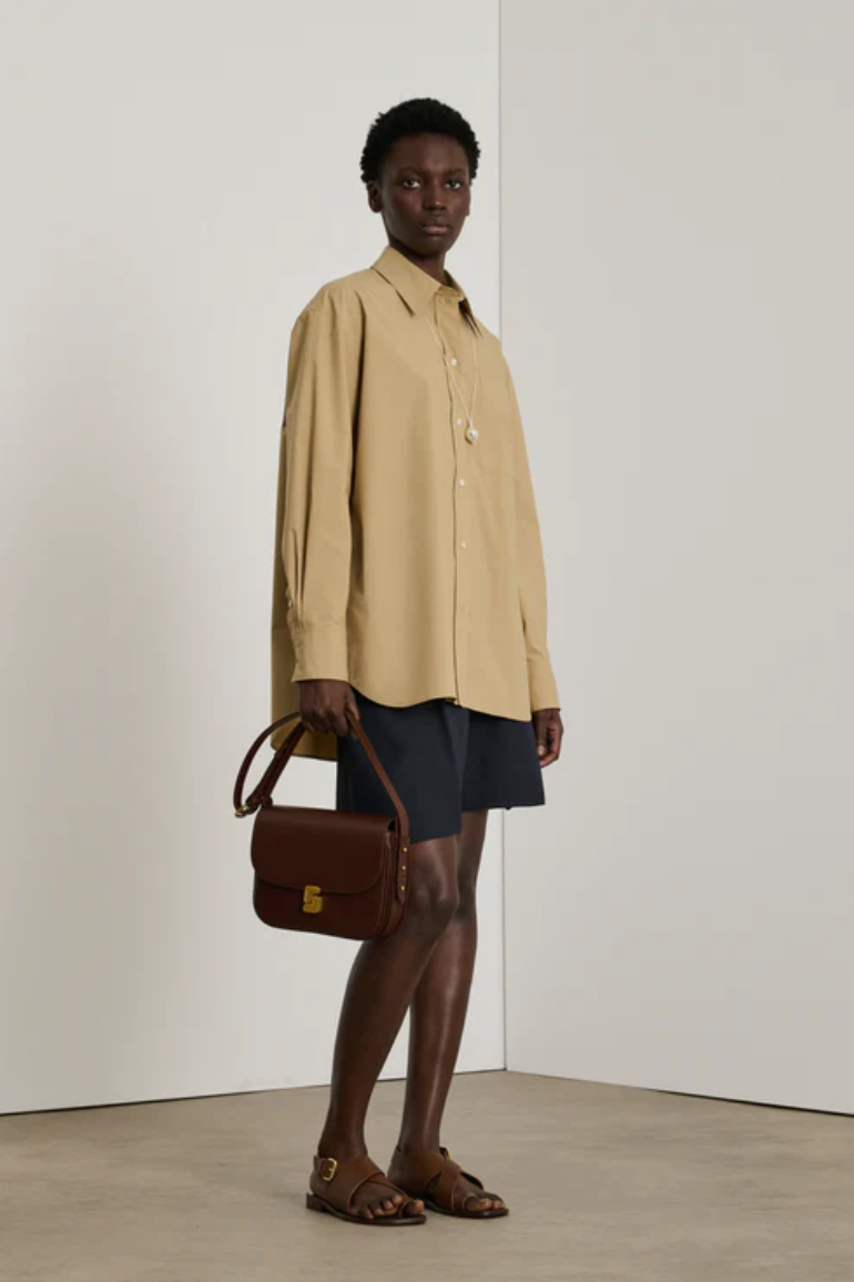 Sac en cuir box moka avec fermoir monogramme doré, porté épaule ou croisé.
