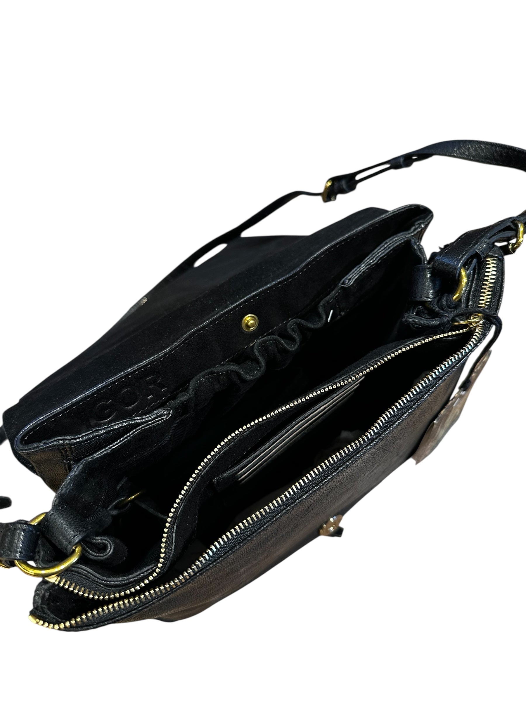 Sac à rabat en cuir de chèvre noir. Bandoulière réglable. Deux soufflets zippés permettant d'ajuster le volume du sac. Intérieur doublé en coton avec trois compartiments dont un zippé et un autre fermé par des pressions.
