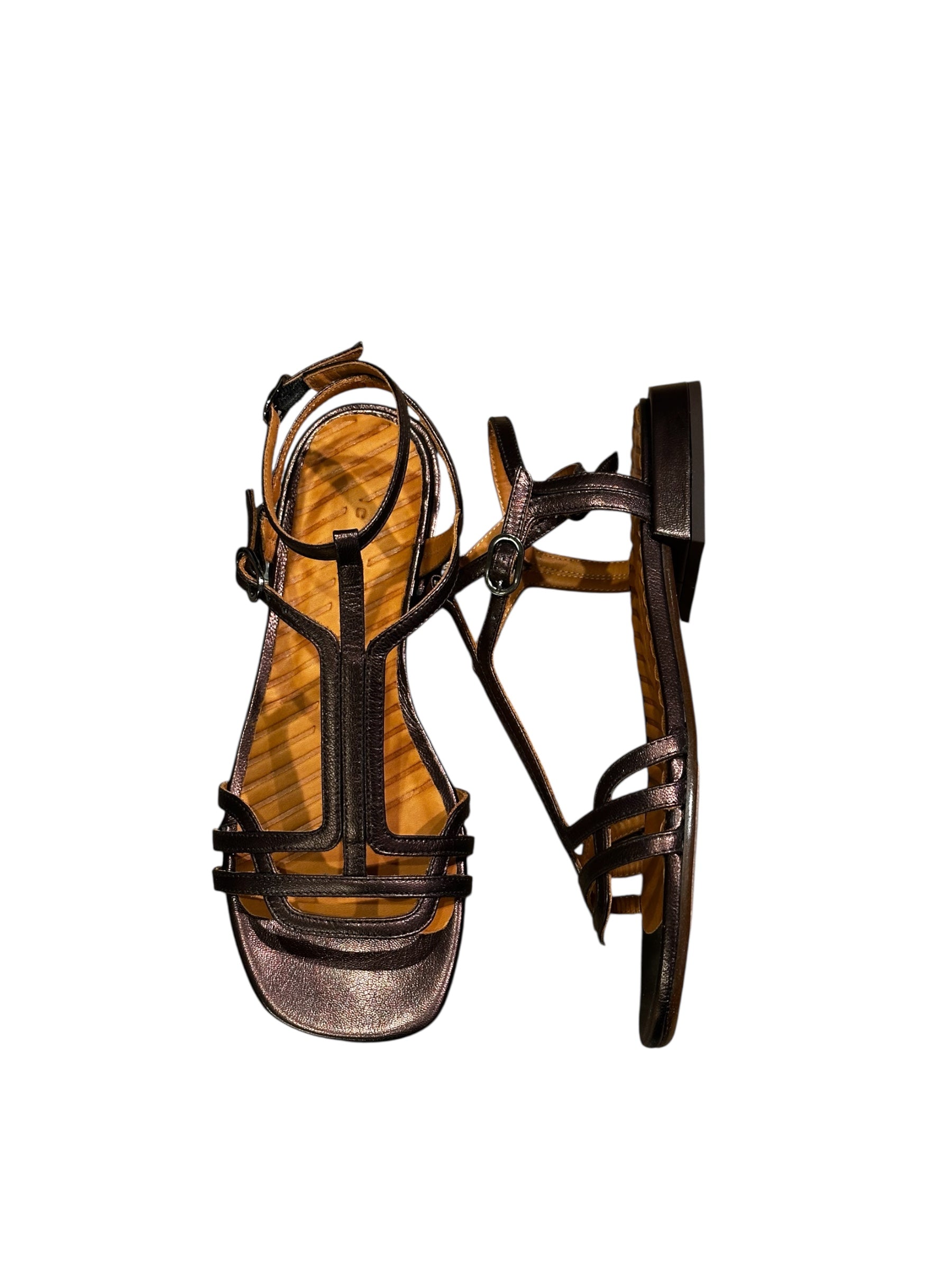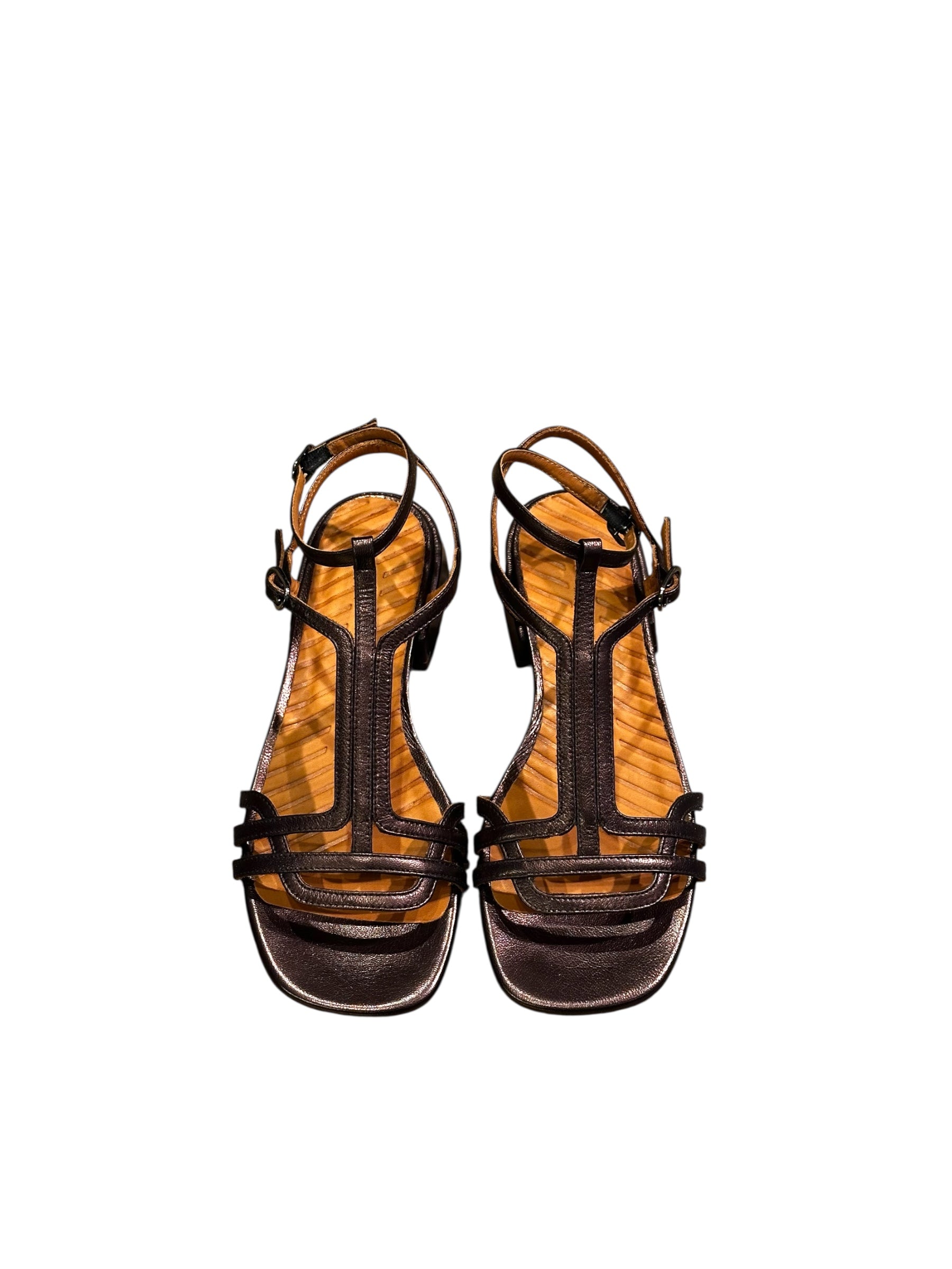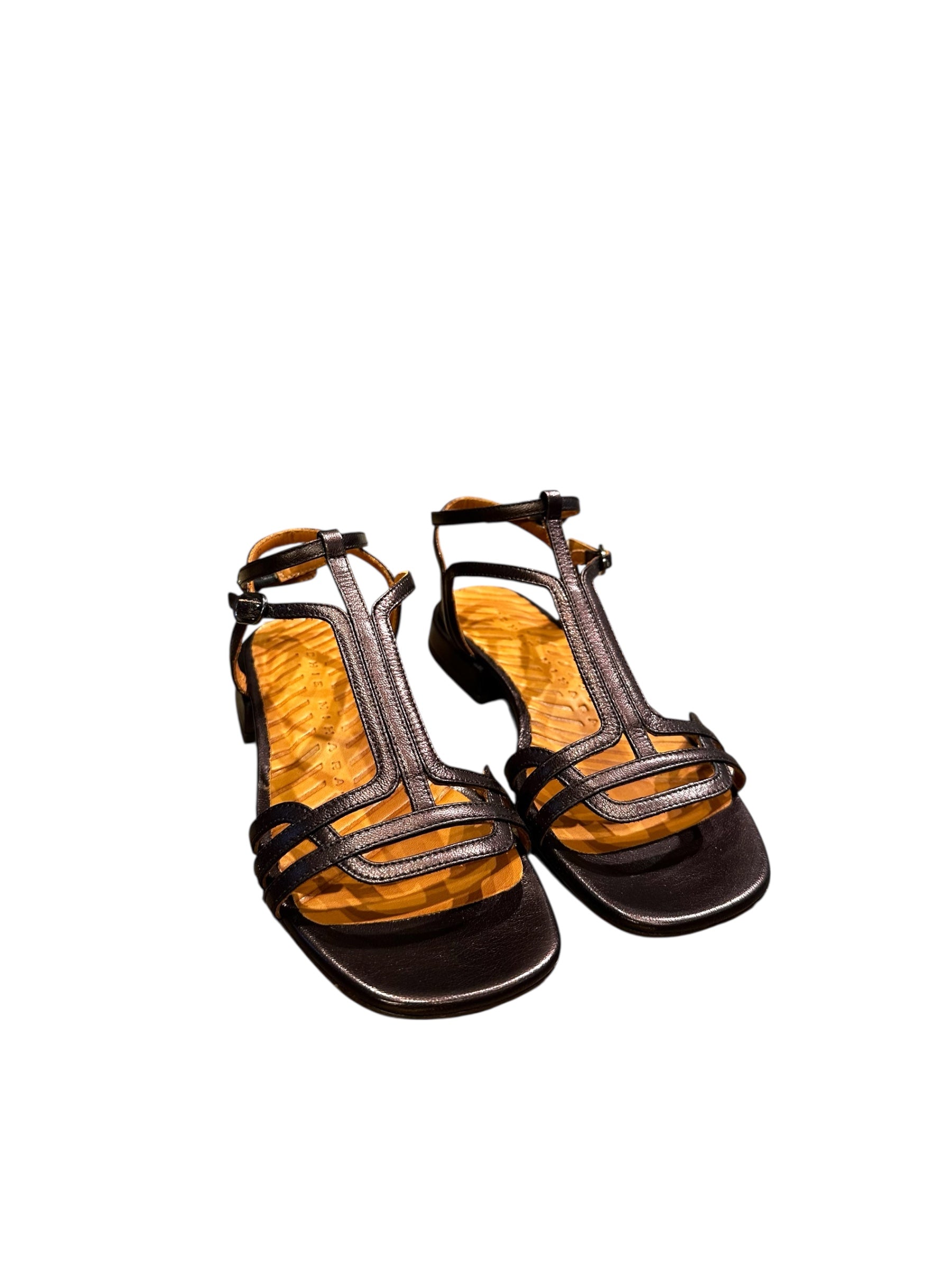 Sandales à petit talon Chie Mihara, coloris café/bronze foncé. Double lanière réglable à la cheville.
