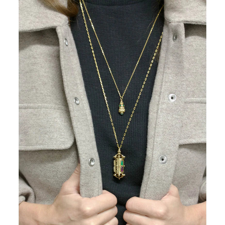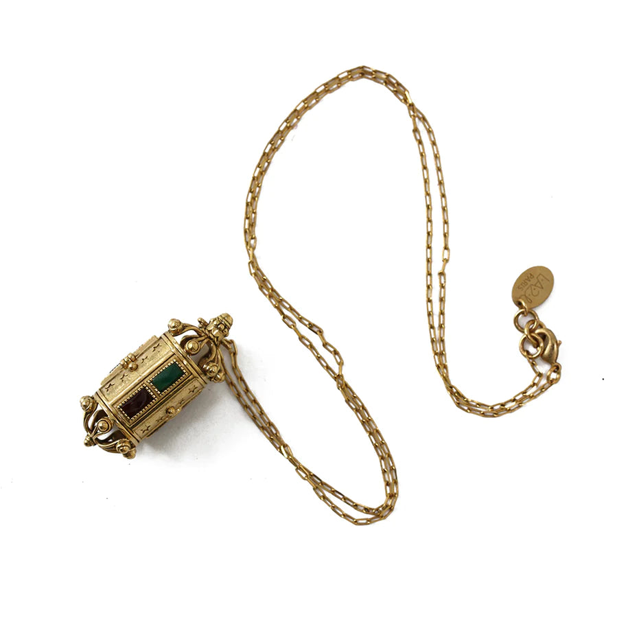 Le Sautoir Jasmine Cage est un collier élégant et raffiné de la marque LA2L, conçu en laiton baigné d'or et orné de pierres semi-précieuses. Le médaillon unique en forme de cage s'ouvre sur le côté, révélant un mélange aléatoire de pierres scintillantes telles que la cornaline, l'améthyste, l'agate verte, le grenat et l'agate bleue. Le pendentif mesure 4 cm de hauteur et la chaîne, d'une longueur de 72 cm, vous permet d'ajuster le sautoir à votre guise pour sublimer votre tenue.