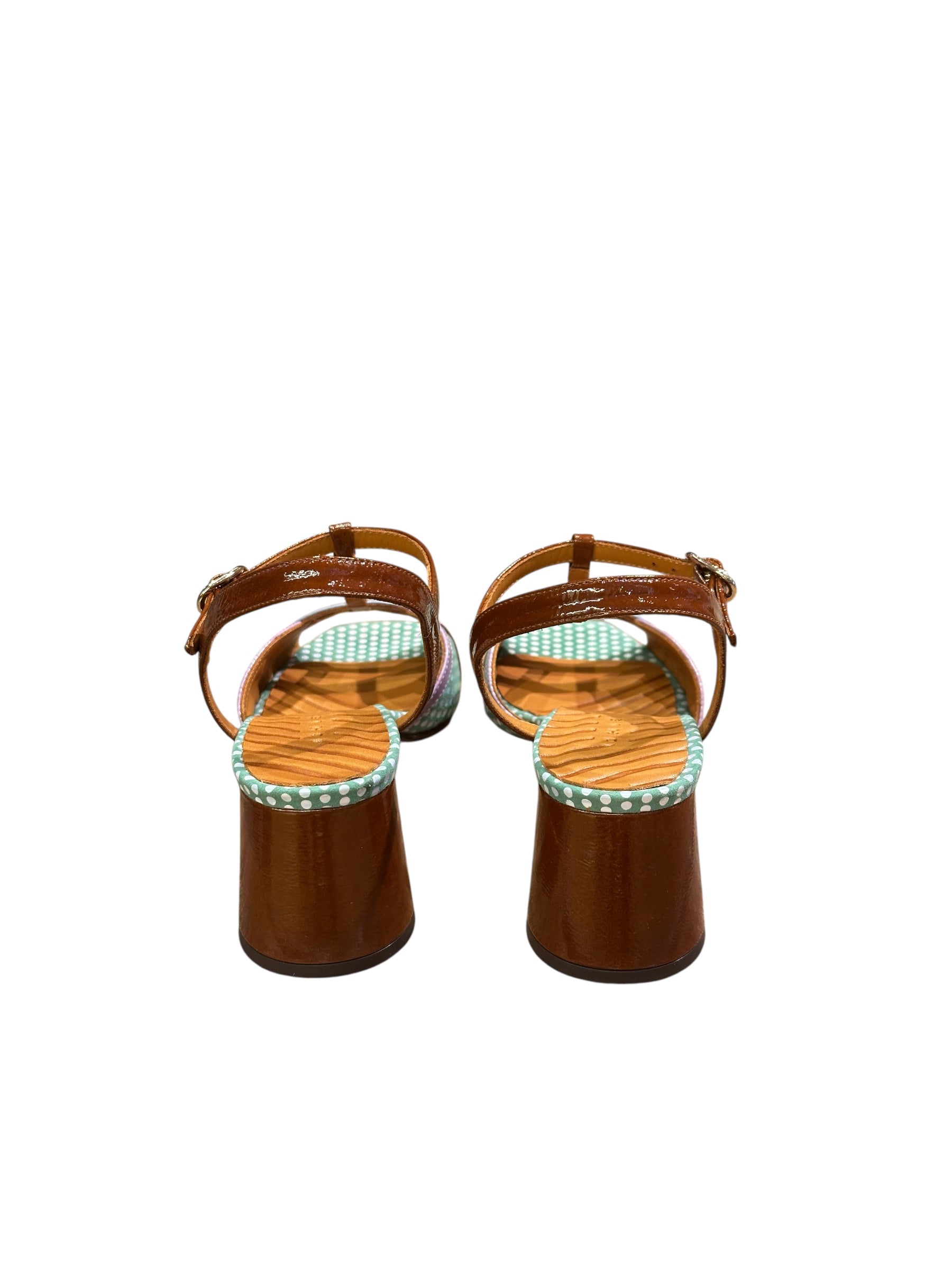 Chaussures à talons Chie Mihara avec liseré marron/rose/lavande, semelle imprimée pois blanc et vert, talon et semelle marron vernis. Lanière réglable à la cheville. Ce modèle est une exclusivité Nous les Libellules, nous avons composé le mix couleurs/matières.