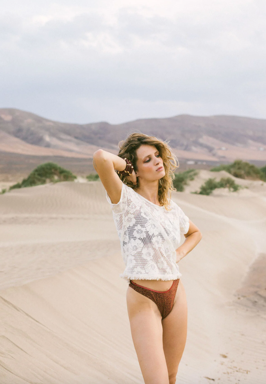 Haut à manches courtes Carlos, dentelle transparente aux motifs floraux. Encolure ronde, coupe fluide, bas en lurex à franges.